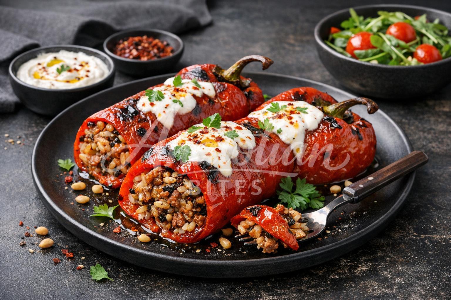 Smoky roasted red peppers filled with aromatic rice, fresh herbs, and pine nuts create a deliciously tender and flavorful dish. The peppers develop a beautiful charred exterior while maintaining their sweet, soft texture inside. This traditional Turkish comfort food makes an impressive vegetarian main course or elegant side dish.