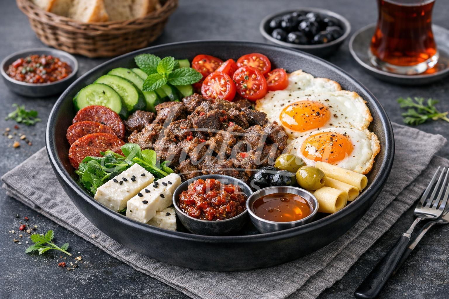 This hearty breakfast bowl features tender, spiced lamb kavurma topped with fried eggs and fresh vegetables. The golden eggs sit atop savory meat with vibrant tomatoes and herbs creating a colorful, satisfying meal. Perfect for weekend mornings when you want a protein-rich Turkish breakfast that keeps you full until lunch.