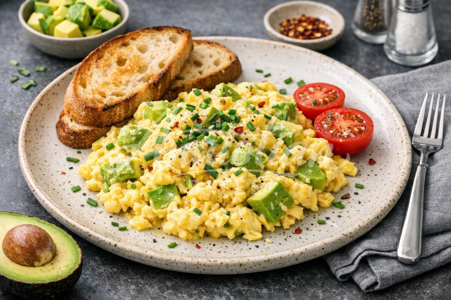 These creamy scrambled eggs combine fluffy, buttery eggs with rich, velvety avocado pieces for a luxurious texture. The golden yellow eggs are studded with bright green avocado chunks and fresh herbs. This modern Turkish breakfast offers a perfect balance of protein and healthy fats to start your day right.