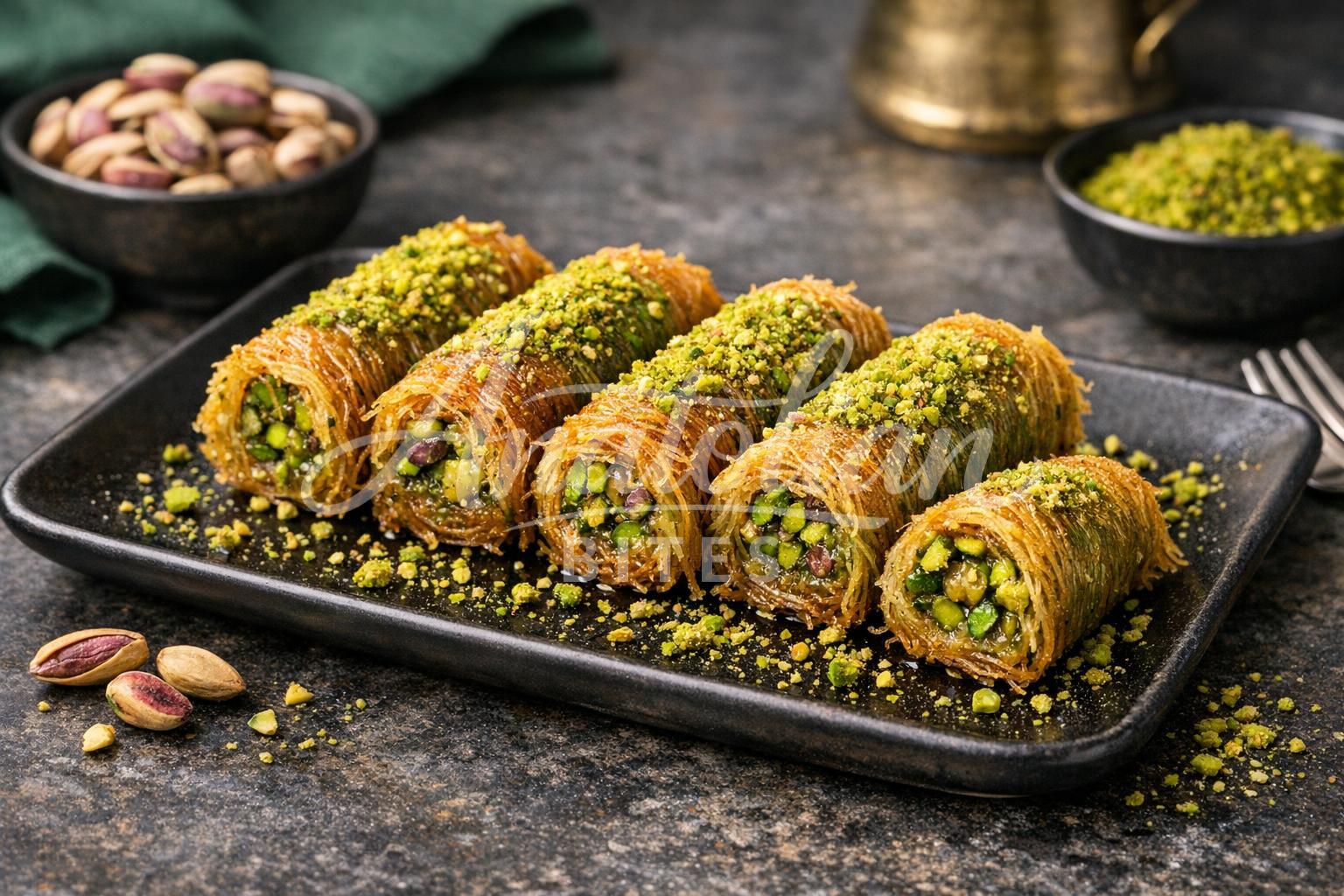 This delicate dessert combines crispy shredded phyllo with rich pistachio filling in a sweet syrup bath. Golden rolls reveal vibrant green pistachio paste that melts on your tongue. It's an elegant dessert that transforms simple ingredients into restaurant-quality perfection.