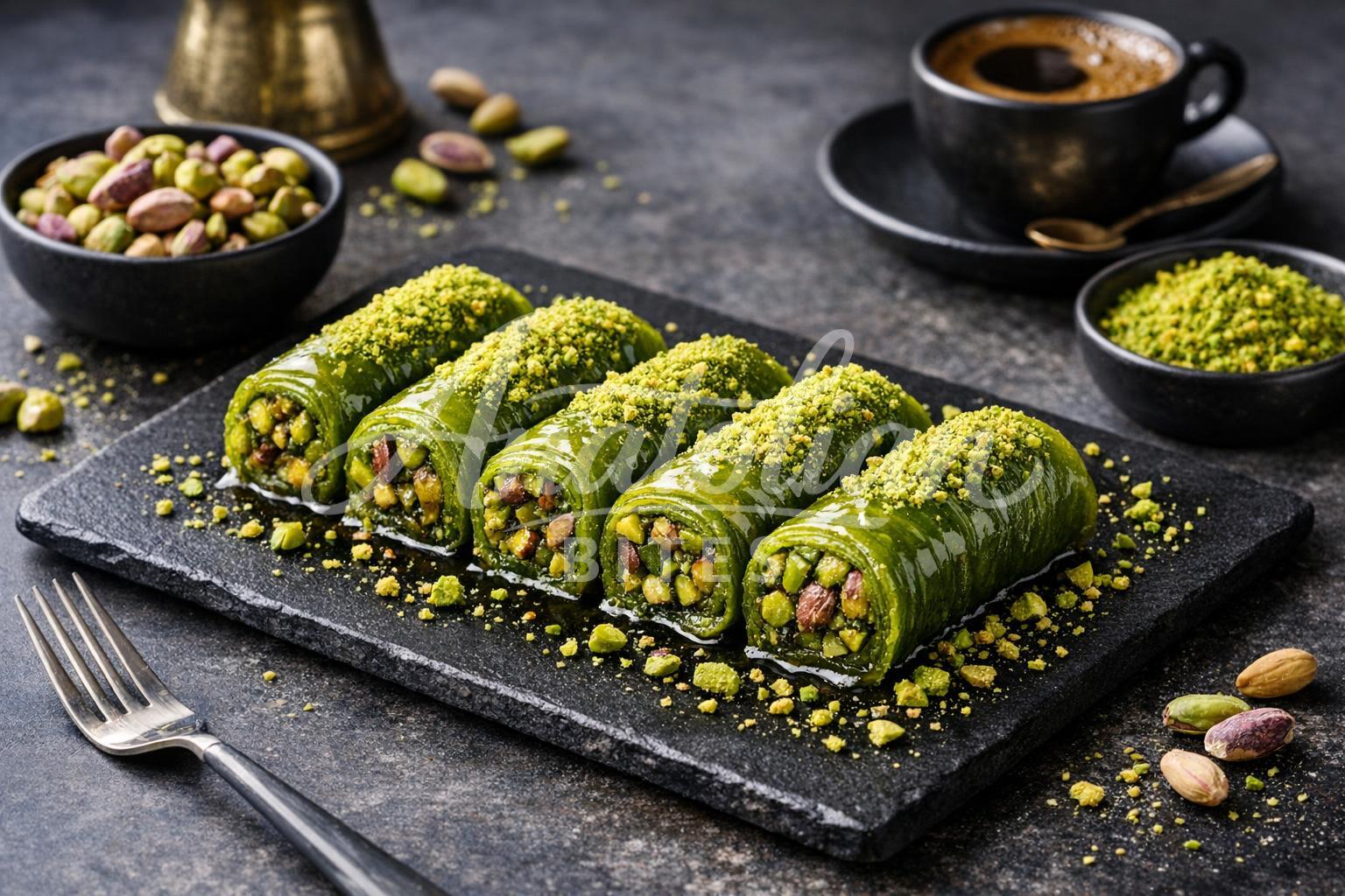 This delicate Turkish pastry combines paper-thin phyllo dough with a rich, aromatic pistachio filling and sweet syrup. The golden rolls emerge from the oven with a satisfying crunch that gives way to tender, nutty layers within. It's an elegant dessert that transforms simple ingredients into something truly special for any celebration.
