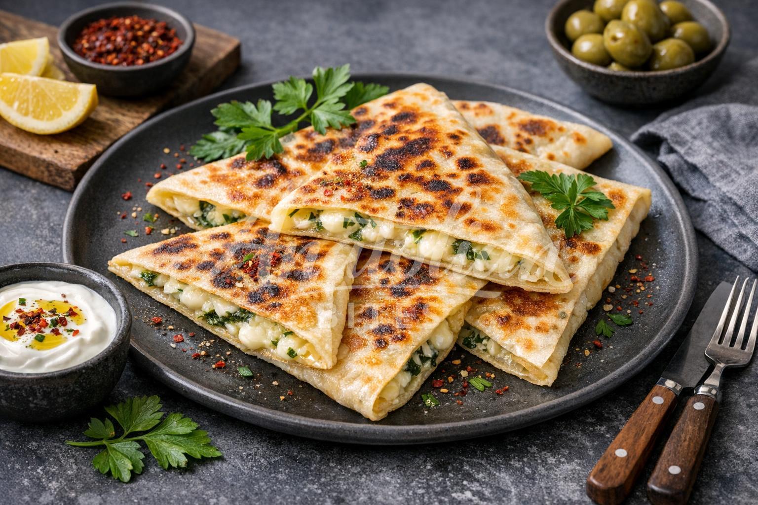 Crispy golden flatbread filled with creamy cheese that melts beautifully when cooked on a griddle. The thin, stretchy dough creates delicate layers with a satisfying contrast between the crunchy exterior and soft, savory interior. This beloved Turkish comfort food makes an ideal breakfast, lunch, or quick snack any time of day.