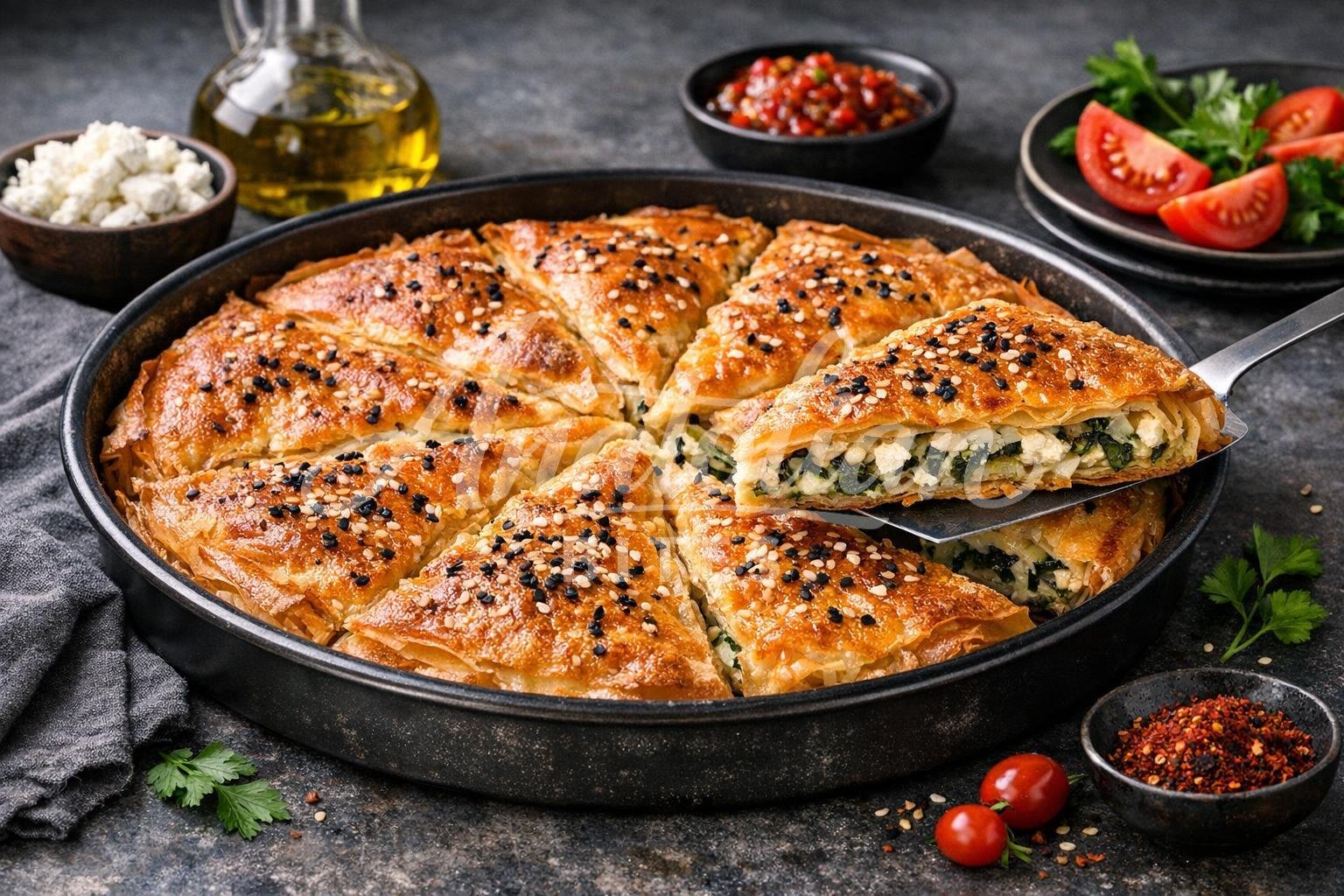 Serve warm cut into squares alongside Turkish tea or ayran, and store covered in refrigerator for up to 3 days - reheat individual pieces in a toaster oven to restore crispness.