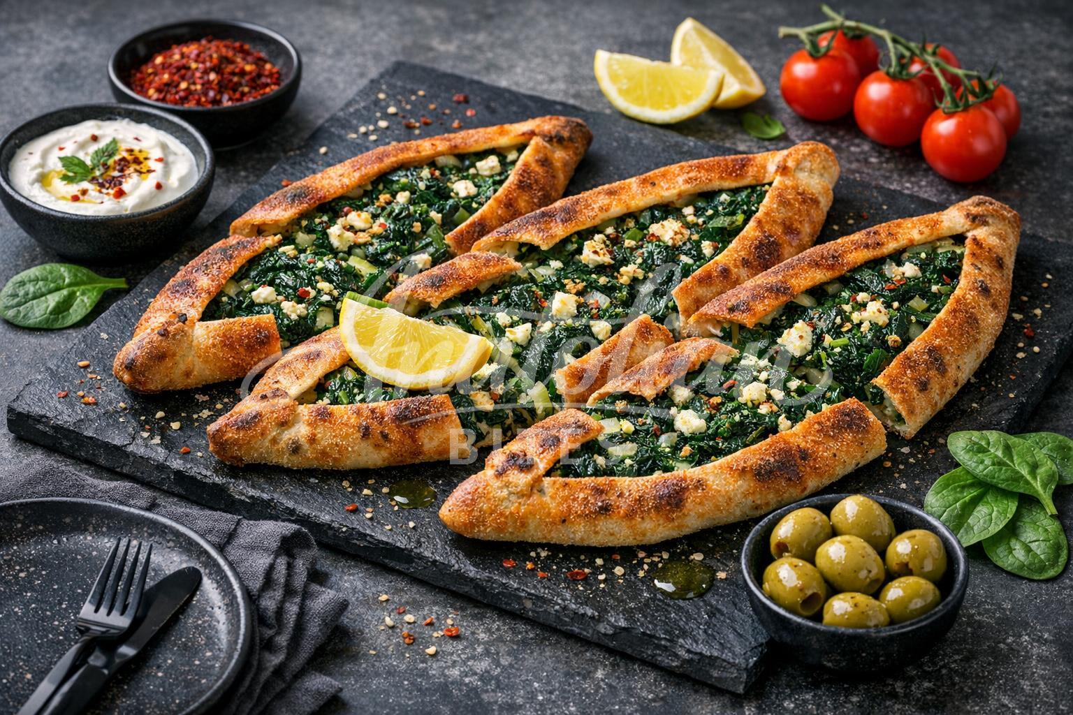 This savory Turkish flatbread features a crispy, golden crust filled with seasoned spinach, onions, and cheese. The boat-shaped bread has a perfectly chewy texture with crispy edges and a flavorful spinach filling. It's an ideal comfort food that works beautifully as a light meal or shared appetizer.