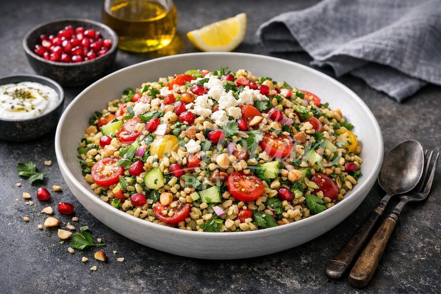 This nutty, smoky freekeh salad bursts with fresh herbs, tangy pomegranate seeds, and a bright lemon dressing. The emerald grains create a beautiful rustic presentation studded with ruby-red pomegranate arils. It's a perfect healthy dish that brings together ancient grains with vibrant Mediterranean flavors.