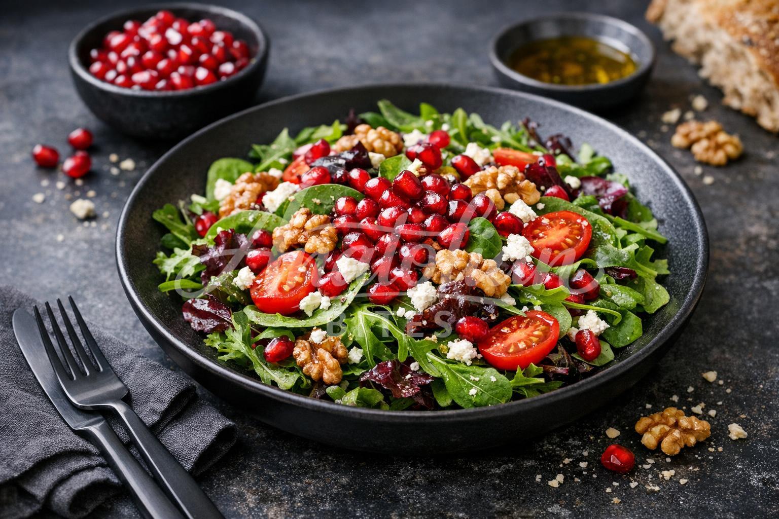 This vibrant salad combines sweet-tart pomegranate seeds with crunchy walnuts and fresh herbs in a tangy sumac dressing. The colorful mixture creates a beautiful contrast of ruby red arils against emerald greens and golden nuts. It's the perfect refreshing side dish that adds elegance and bold flavors to any meal.