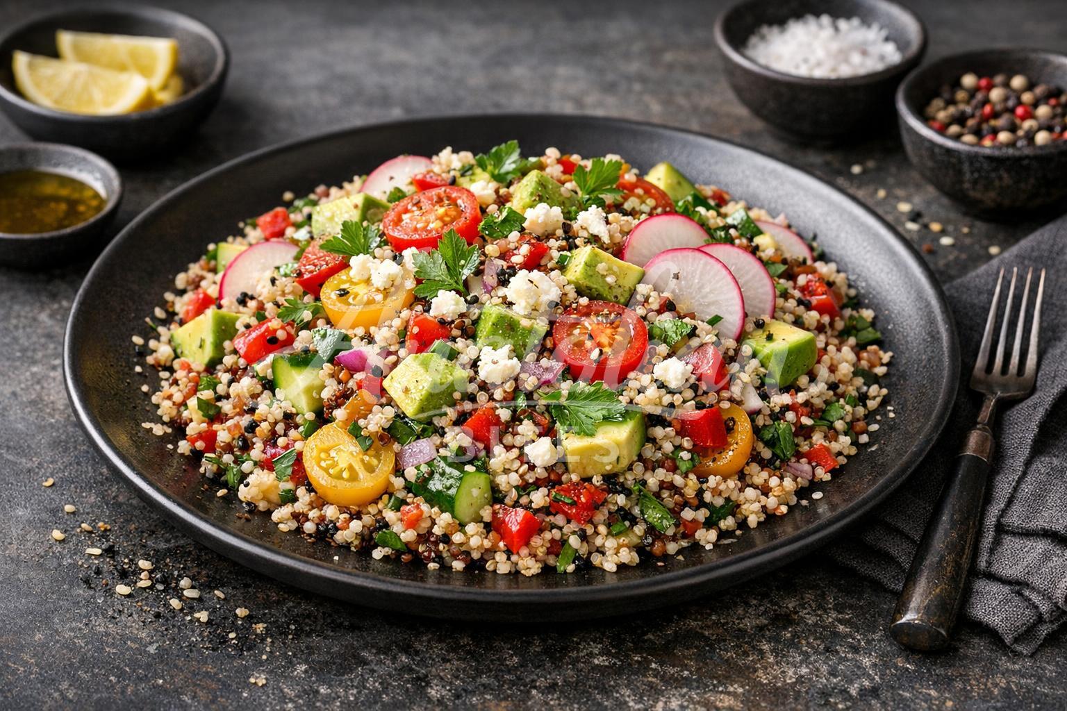 Mix cooled quinoa with diced vegetables and herbs in a large bowl over no heat for 3-4 minutes. Add pomegranate seeds and pour dressing over mixture, tossing gently until evenly coated. The salad should look colorful and well-combined. Do not overmix or pomegranate seeds will burst.
